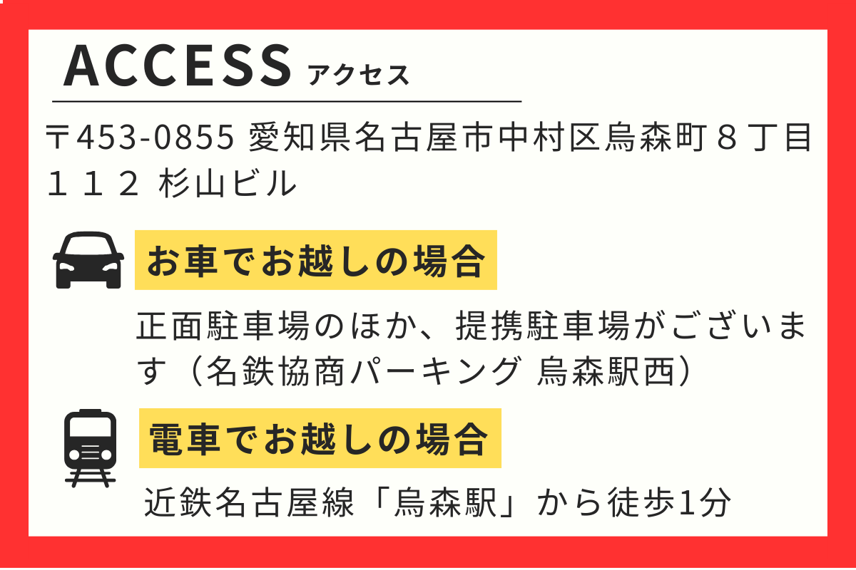 【場所】〒453-0855 愛知県名古屋市中村区烏森町8丁目112 杉山ビル